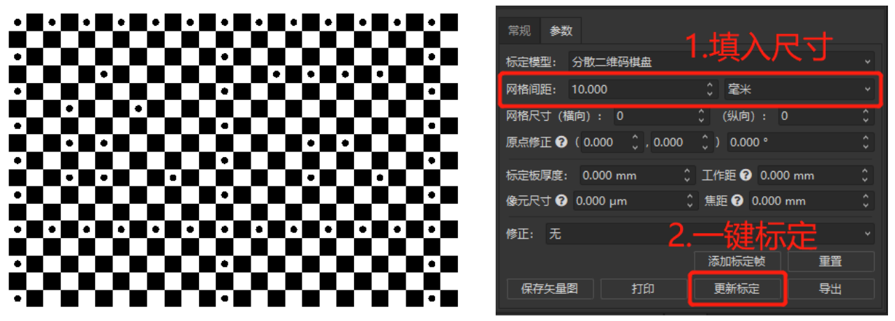 通過(guò)市場(chǎng)需求的調研,我們發(fā)現圖1中傳統棋盤(pán)格標定的流程比較復雜,用戶(hù)除了需要知道網(wǎng)格的尺寸以外,還要通過(guò)數的方式確定在相機視野中的網(wǎng)格數量來(lái)完成標定,如果實(shí)際應用場(chǎng)景中網(wǎng)格間距尺寸比較小,用戶(hù)很可能數錯導致最后標定失敗。