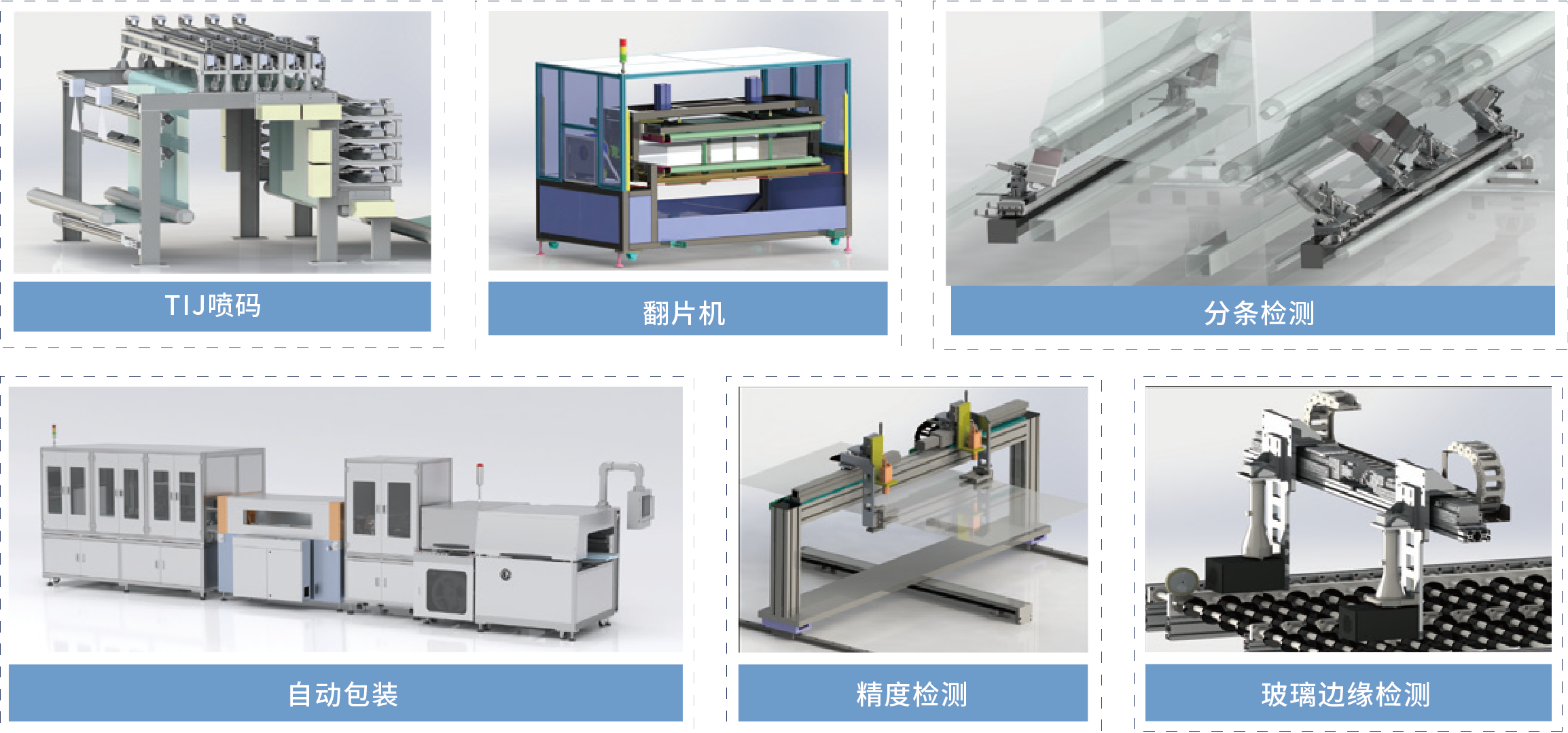 TIJ噴碼、翻片機、分條檢測、自動(dòng)包裝、精度檢測、玻璃邊緣檢測