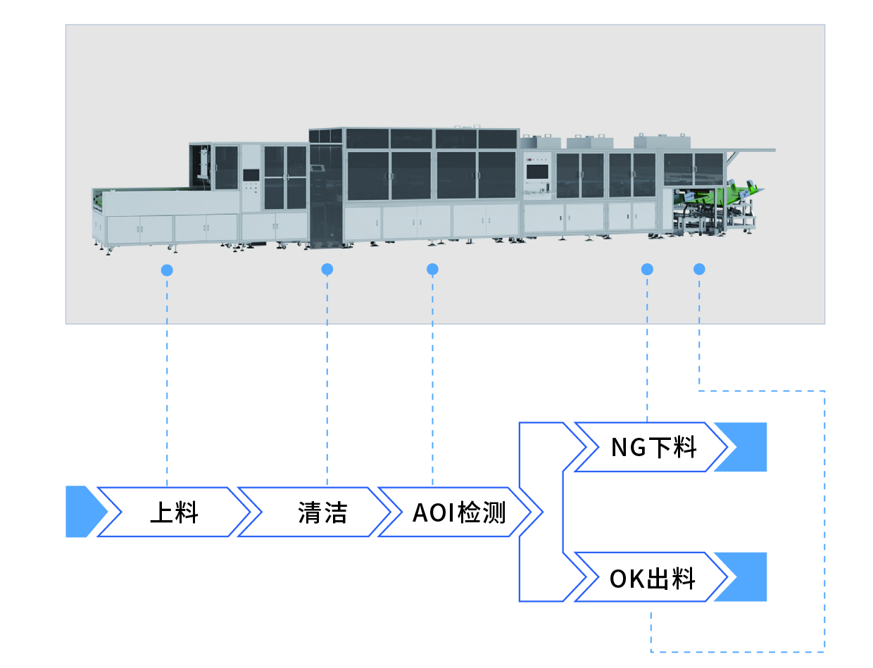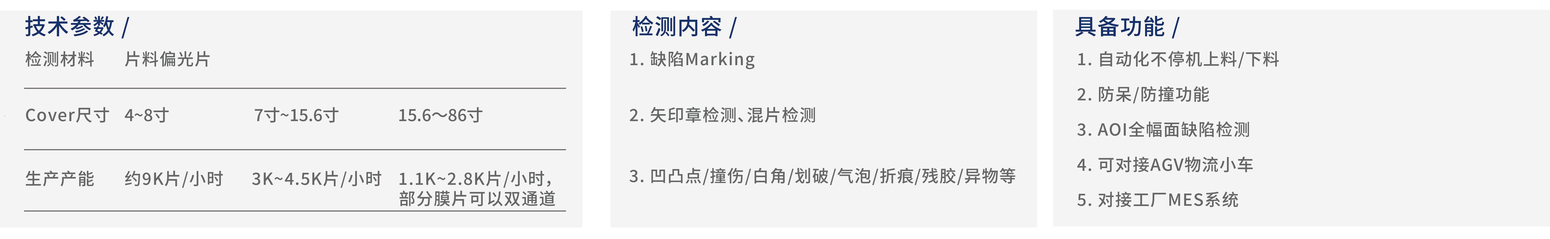 設備用于偏光片的檢測,采用自動(dòng)上下料以及特制輸送結構,搭配自研AOI檢測軟件,對矢印章、缺陷打標Mark、異物、氣泡、劃傷、凹凸點(diǎn)、折痕、撞傷、殘膠、臟污等缺陷進(jìn)行精準檢測以及OK/NG分流,把控出貨產(chǎn)品質(zhì)量。